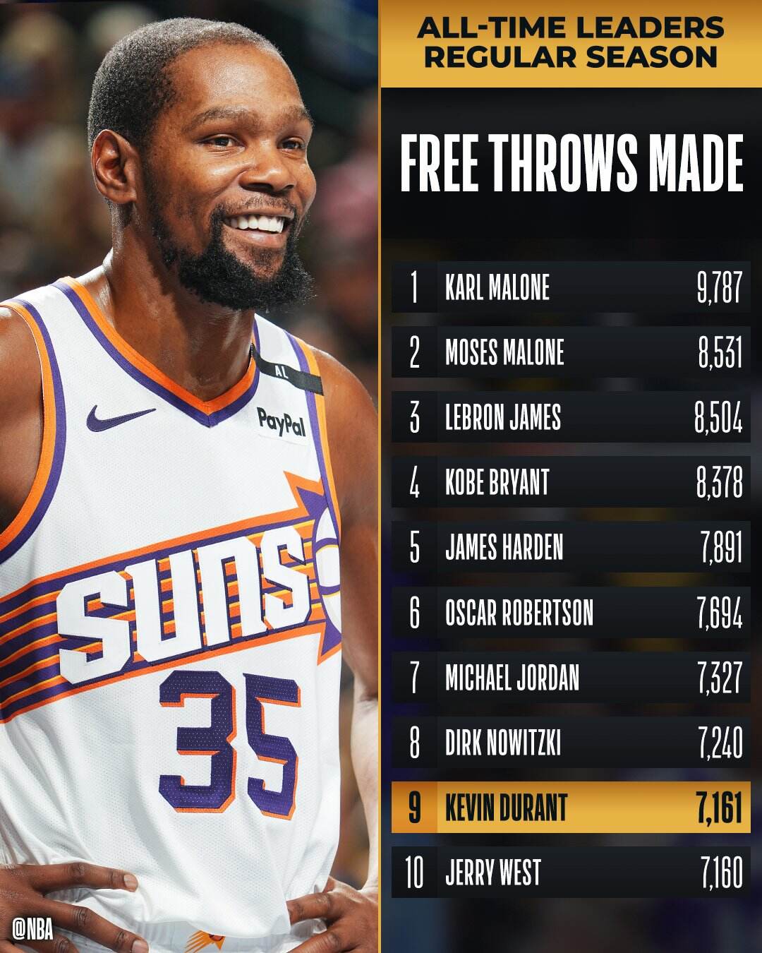 据统计,本场比赛后,杜兰特职业生涯的罚球总命中数正式超越名宿韦斯特,升至联盟历史第9名。(NBA)